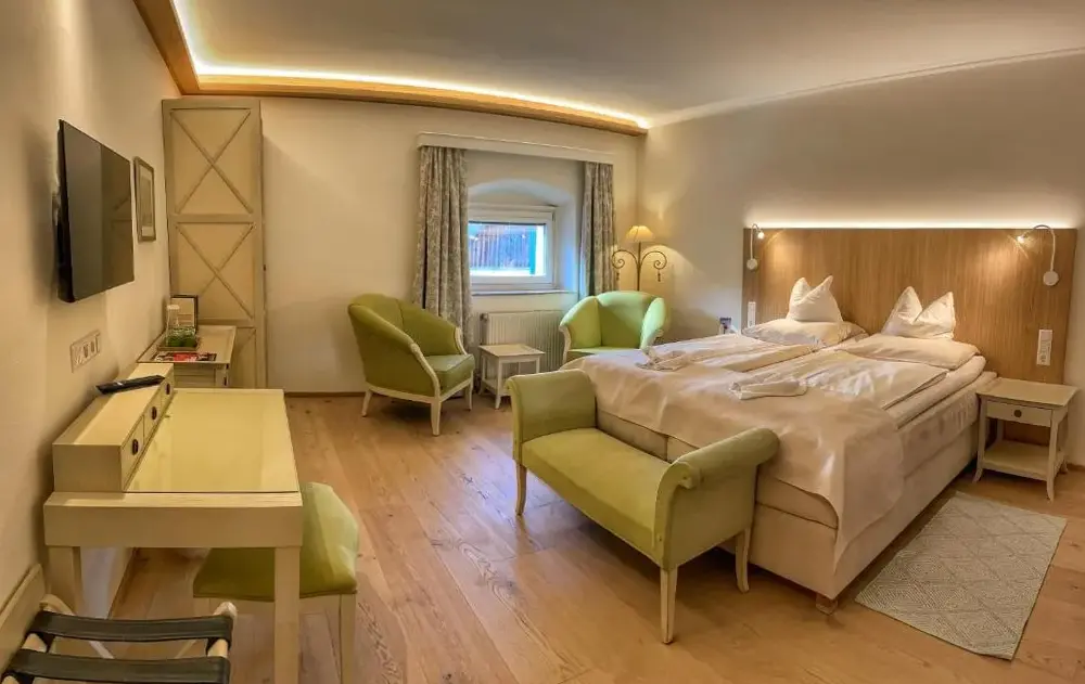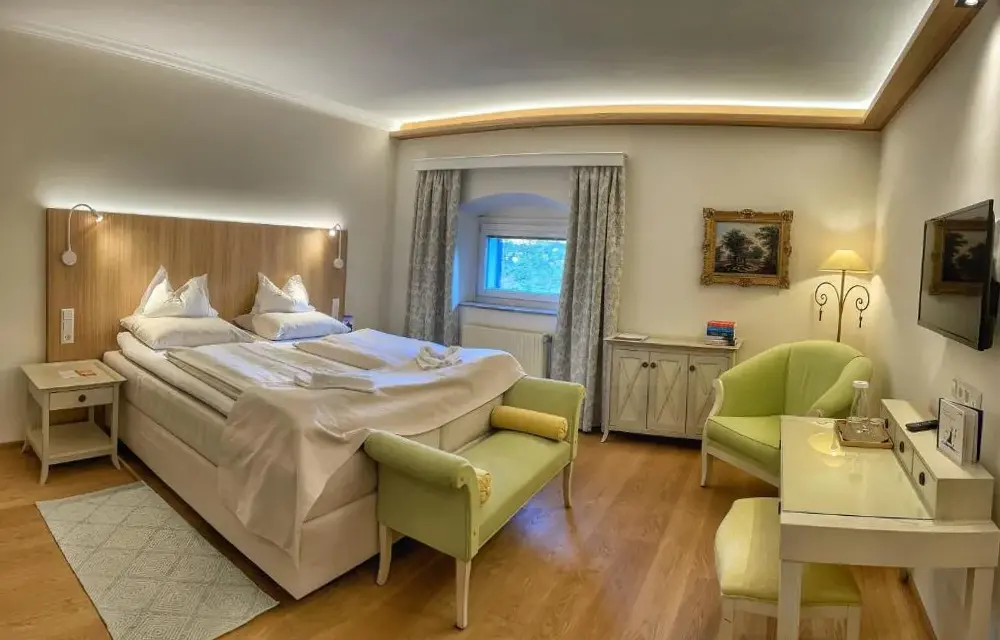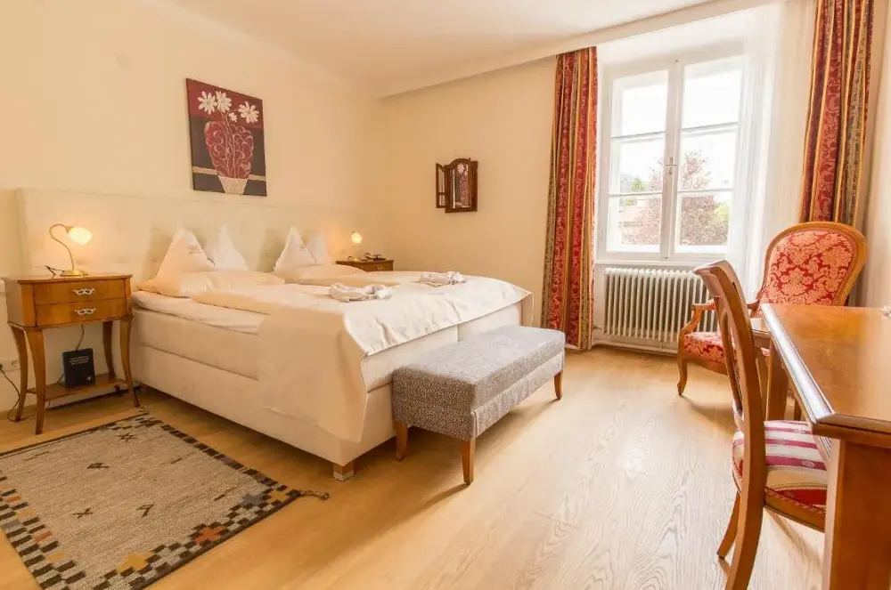 Herausragend fürsorglicher Service, von den Inhabern bis zum Personal. Die aus der Ortschaft herausgelöste Lage machen diesen Ort zu einer Oase der Ruhe und Entspannung. Das historische Ambiente wirkt hier zusätzlich angenehm entschleunigend. Ich glaube nicht, das ich jemals schon einmal in so bequemen Betten geschlafen hätte!